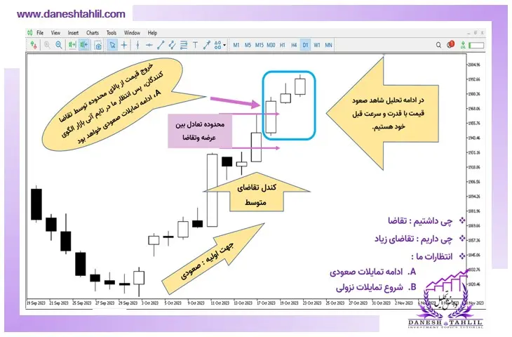 بادقت در تصویر فوق می‌توان کاهش حجم تقاضا در بازار را در تایم بعدی مشاهده کنید. در این الگو تقاضاکنندگان طی یک درگیری با عرضه‌کنندگان توانستند با ایجاد تقاضایی که در مارکت ایجاد نمودند خط بالایی محدوده تعادل را بشکنند و فاتحانه قیمت را به سمت بالاتر سوق دهند.