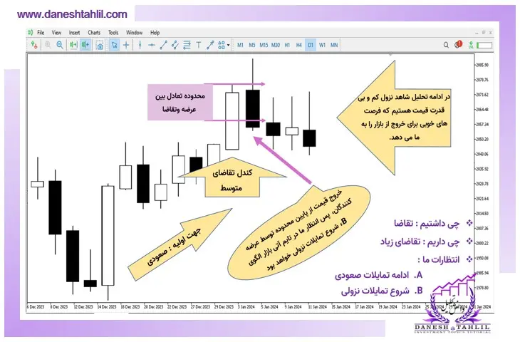 باتوجه‌به این مثال متوجه شده‌اید که چه میزان تقاضا از بازار کم شده است. پس باید انتظار درگیری بیشتر و چالش‌برانگیزتری بین عرضه‌کنندگان و تقاضاکنندگان را در محدوده تعادل داشته باشیم و ما به‌عنوان معامله‌گر یا سرمایه‌گذار باید زمان بیشتری را برای تعیین تکلیف بین دو گروه در نظر بگیریم و از تصمیم‌گیری عجولانه و ارسال هرگونه سفارش خرید غیرمنطقی خودداری کنیم.