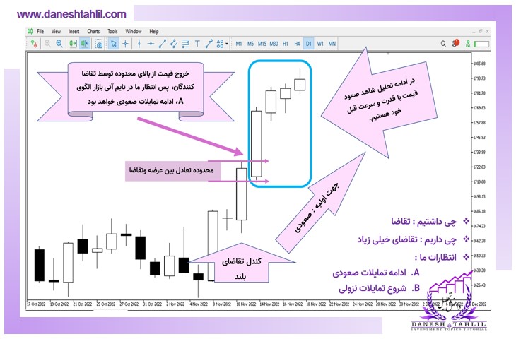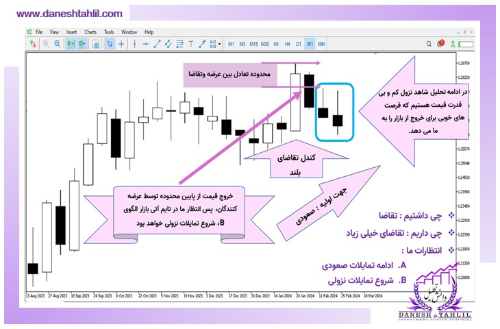 جوابی که میتوان برای این سؤال عنوان نمود این است که اگر در بازه زمانی تحلیل (روزانه، هفتگی، ماهیانه) برایند تقاضا از عرضه بیشتر باشد و در نهایت تقاضای باقیمانده در کندل ایجاد شود، شاهد تشکیل یک کندل تقاضا خواهیم بود. پس باتوجهبه اینکه درگذشته تقاضا داشتیم و کندل صعودی را هم شاهد هستیم. متوجه میشویم که غالب افراد متقاضی، پوزیشن خرید خود را حفظ نمودهاند و کماکان بهعنوان سهامدار سهم موردنظر مطرح هستند. قاعدتاً در بازه انتهایی بازار (زمان حال)، سرمایهگذاران برای افزایش تعداد سهم نماد موردنظر، عوامل مختلف فاندامنتالی و تکنیکالی آن را مورد بررسی و تحلیل قرار میدهند تا بتوانند برای ارسال سفارش خرید و افزایش تعداد آن سهم تصمیمگیری کنند.