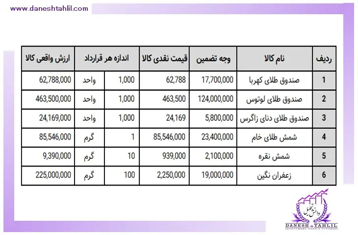 2- در این مرحله باید طبق فرمول زیر “اندازه حجم کالا در هر قرارداد” را در قیمت نقدی هر کالا” ضرب کرده تا “ارزش واقعی کالاها” مشخص شود (همانند جدول)