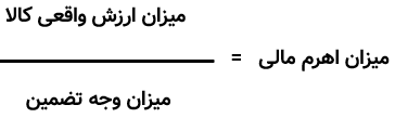 3- در مرحله نهایی برای اینکه میزان اهرم مالی هر کالا را متوجه شویم باید با توجه به فرمول ذیل “میزان ارزش واقعی کالا” را بر “میزان وجه تضمین” تقسیم نماییم.