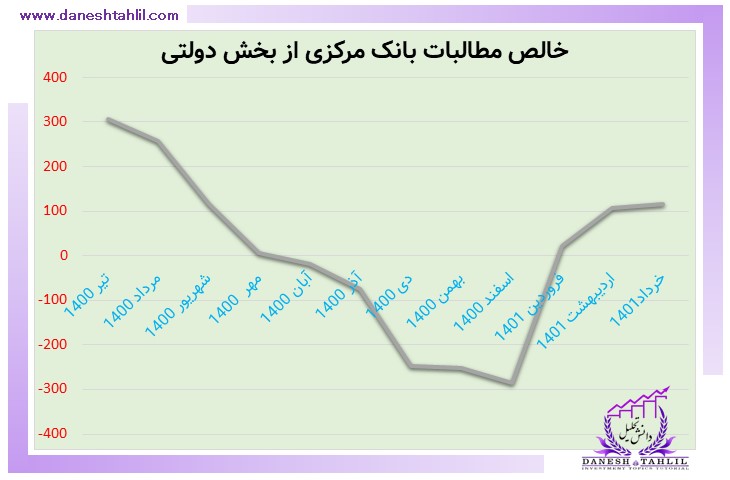 و اما همانطور که در نمودار ذیل مشاهده مینمایید شاخص “مطالبات بانک مرکزی از بخش دولتی ” در 9 ماه انتهایی سال 1400 روندی نزولی داشته ولیکن از ابتدای سال 1401 تغییر مسیر داده و افزایش شده است. این موضوع بیانگر بدهی دولت به بانک مرکزی بوده و هر چه بر میزان آن افزوده میشود اوضاع بدتر خواهد شد، چرا که در نهایت به چاپ پول، در نتیجه افزایش نقدینگی و پایه پولی خواهد انجامید.