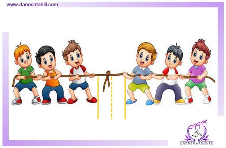 هر دو گروه با گرفتن دوسر مختلف طناب منتظر اعلام شروع مسابقه از سوی داور هستند آنها بر اساس گفته داور فقط تا جایی می‌توانند زور بزنند و طناب را بکشند که علامت گذاشته شده وسط طناب از دو خط نارنجی عبور ننماید. با گذر طناب از یک خط نارنجی با نتیجه برنده‌شدن آن تیم بازی به اتمام می‌رسد. در بازار نیز دقیقاً به همین صورت اتفاق می‌افتد با این تفاوت که تحلیل‌گران به‌جای داور، خریداران و فروشندگان هرکدام به‌جای یکی از تیم‌ها و محدوده مشخص شده با خط نارنجی توسط داور دقیقاً محدوده تعادل است. ما با نظاره‌گر شدن به زورآزمایی بین خریداران و فروشندگان، به‌محض عبور قیمت از خطوط نارنجی، بازار را جولانگاه آن گروه خاص می‌دانیم و با باز نمودن پوزیشن در جهت آن گروه از منافع تغییرات قیمتی استفاده می‌نماییم. اگر گروه تقاضاکنندگان پیروز میدان باشند بهترین استراتژی، خرید (Buy) و در صورت پیروزی عرضه‌کنندگان بهترین استراتژی، فروش استقراضی (Short) خواهد بود.