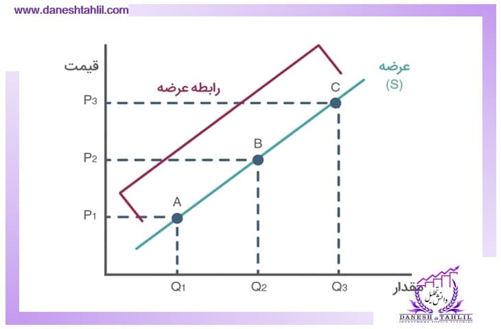 میزان کالا یا خدمتی که تولیدکنندگان حاضر هستند در ازاء قیمت معینی در واحد زمان به بازار ارائه دهند. مجموعه (قیمت، شرایط تولید، مقررات دولتی، تعدد عرضه‌کنندگان و انتظارات بازار) عوامل تأثیرگذار بر قیمت است که جهت آن را نزولی می‌نماید. هر چه قیمت (P1) پایین‌تر باشد عرضه (Q1) کم بوده و با افزایش قیمت (P3) عرضه (Q3) نیز افزایش خواهد یافت؛ زیرا فروش تعداد زیادی محصول در قیمتی بالاتر، درآمد تولیدکننده را بیشتر می‌نماید.