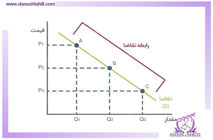 تقاضا میزان تمایل و درخواست خرید جهت به‌دست‌آوردن کالا یا خدمات است. مجموعه (قیمت، تعداد مصرف‌کنندگان در بازار، سلیقه مصرف‌کنندگان، درآمد پولی و قیمت سایر کالاهای مرتبط) عوامل تأثیرگذار بر قیمت است که جهت آن را صعودی می‌نماید. هر چه میزان قیمت (P3) کمتر باشد تقاضا (Q3) بیشتر می‌شود و بالعکس هر چه قیمت (P1) افزایش داشته باشد میزان تقاضا (Q1) کاهش می‌یابد در نتیجه، مصرف‌کننده به طور طبیعی از خرید محصول چشم‌پوشی می‌کنند.