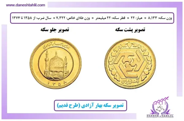 - سکه تمام بهارآزادی (طرح قدیم): سکه تمام بهارآزادی که معمولاً بهعنوان سکه کامل شناخته میشود، دارای وزن 8.133 گرم است و از طلای 22 عیار با قطر 22 میلیمتر ساخته شده است. وزن طلای خالص آن 7.322 گرم بوده و از سال 1358 تا سال 1374 تولید شده است. این سکه به عنوان یکی از مهمترین ابزارهای سرمایهگذاری و حفظ ارزش در ایران شناخته میشود.