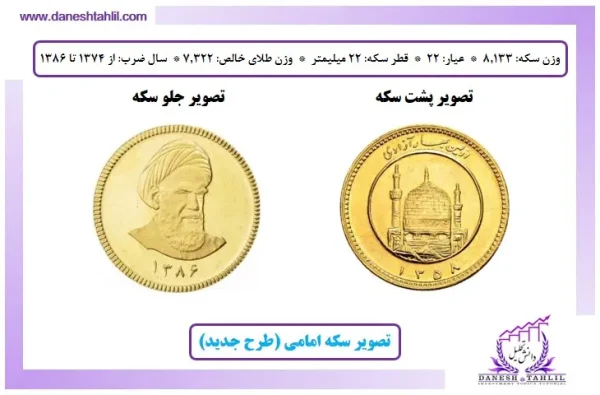 - سکه تمام امامی (طرح جدید): سکه تمام امامی بهعنوان سکه کامل شناخته میشود، این سکه دارای وزن 8.133 گرم است و از طلای 22 عیار با قطر 22 میلیمتر ساخته شده است. وزن طلای خالص آن 7.322 گرم بوده و از سال 1374 تا سال 1386 تولید شده است. این سکه به واسطه جدید بودن و استقبال بیش از حد سرمایه گذاران، روتین بازار شده و به عنوان یکی از مهمترین ابزارهای سرمایهگذاری و حفظ ارزش در ایران شناخته میشود و بیشترین حجم معاملات در بازار سکههای بانکی به این نوع سکه اختصاص دارد. بر روی سکه تصویر بارگاه ملکوتی آقا امام رضا (ع) و بر پشت آن نام مبارک امیرالمومنین آقا علی ابن ابیطالب (ع) نقش بسته است.