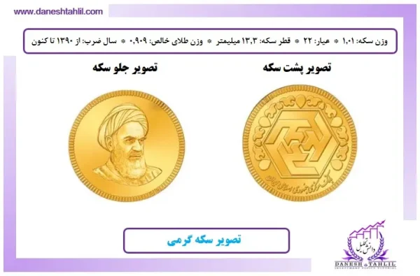 - سکه گرمی: سکه گرمی که بهعنوان کوچکترین نوع سکه بانکی طلا در ایران شناخته میشود، دارای وزنی حدود 1.01 گرم است. این سکه نیز همانند ما بقی سکه ها از طلای 22 عیار با قطر 13.3 میلیمتر ساخته می شود. وزن طلای خالص آن 0.909 گرم بوده و از سال 1390 تاکنون تولید شده است. این سکه معمولاً برای هدیه و یا سرمایهگذاریهای جزئی مورد استقبال عموم مردم قرار گرفته است. بر روی سکه تصویر امام خمینی (ره) و بر پشت آن نام مبارک امیرالمومنین آقا علی ابن ابیطالب (ع) نقش بسته است.
