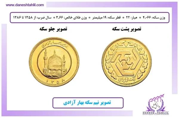 - نیمسکه بهارآزادی: نیمسکه بهارآزادی نیز یکی از پرطرفدارترین انواع سکه در ایران است. وزن این سکه 4.0665 گرم است و از همان طلای 22 عیار با قطر 19 میلیمتر ساخته شده است ساخته شده است. وزن طلای خالص آن 7.322 گرم بوده و از سال 1358 تا سال 1386 تولید شده است. نیمسکهها به دلیل وزن کمتر و قیمت مناسبتر در مقایسه با سکههای تمام، برای سرمایهگذارانی که به دنبال گزینههای کوچکتر هستند، جذابیت دارند. بر روی سکه تصویر امام خمینی (ره) و بر پشت آن نام مبارک امیرالمومنین آقا علی ابن ابیطالب (ع) نقش بسته است.